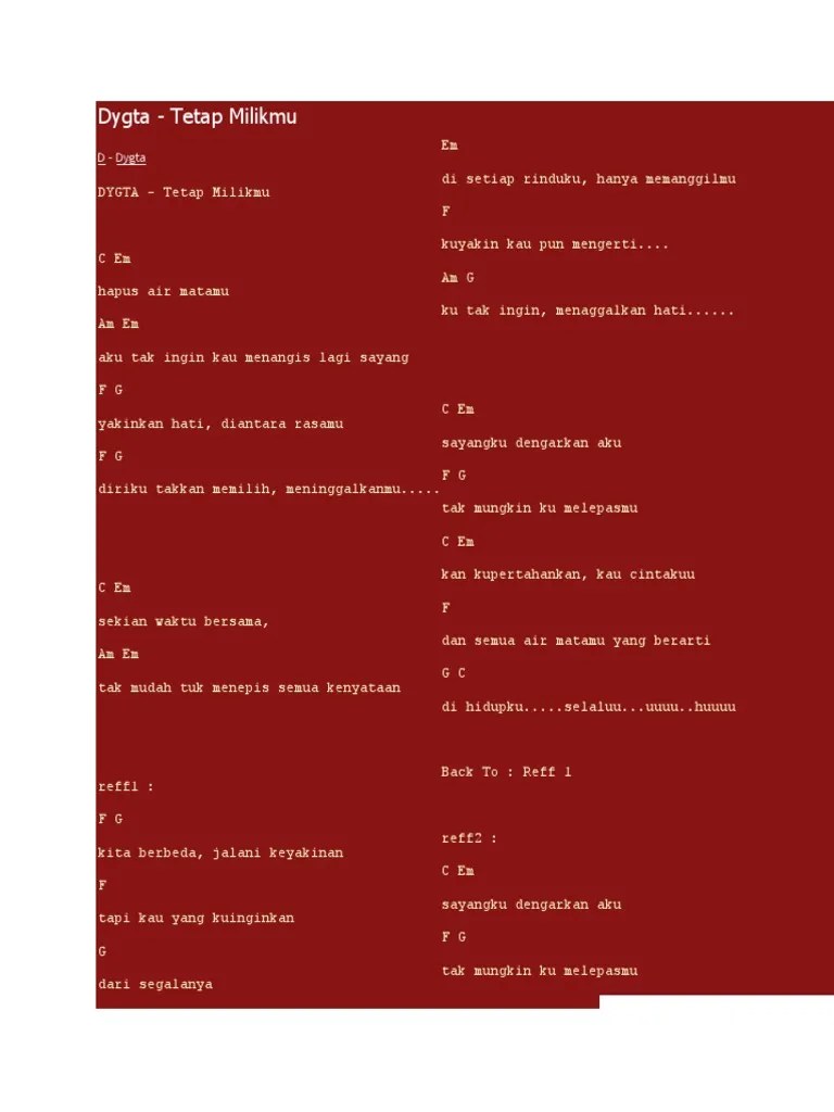 C g dengarkan aku wahai sayangku am em dengarkanlah isi hati ku f c . E b dengarkan aku wahai sayangku. C g dengarkan aku wahai sayangku am em dengarkanlah isi hati ku f c hanya kamu semangat hidupku g hanya kamu. Am em dengarkanlah isi hatiku Chord souqy aku sayang banget sama kamu. Chord gitar don't look back . Souqy aku sayang banget sama kamu chord intro e e b dengarkan aku wahai sayangku c#m g#m dengarkanlah isi hatiku . E… e b dengarkan aku.wahai sayangku. C g dengarkan aku wahai sayangku am em dengarkanlah isi hati ku f c hanya kamu semangat hidupku g hanya kamu. (intro) a a e dengarkan aku wahai sayangku f#m c#m dengarkanlah isi hatiku. (intro) c g c g dengarkan aku wahai sayangku. Nella kharisma (intro) g g d dengarkan aku wahai sayangku em bm dengarkanlah isi hatiku berita chord gitar di chord gitar, Kunci gitar & lirik lagu | kordgitaris.