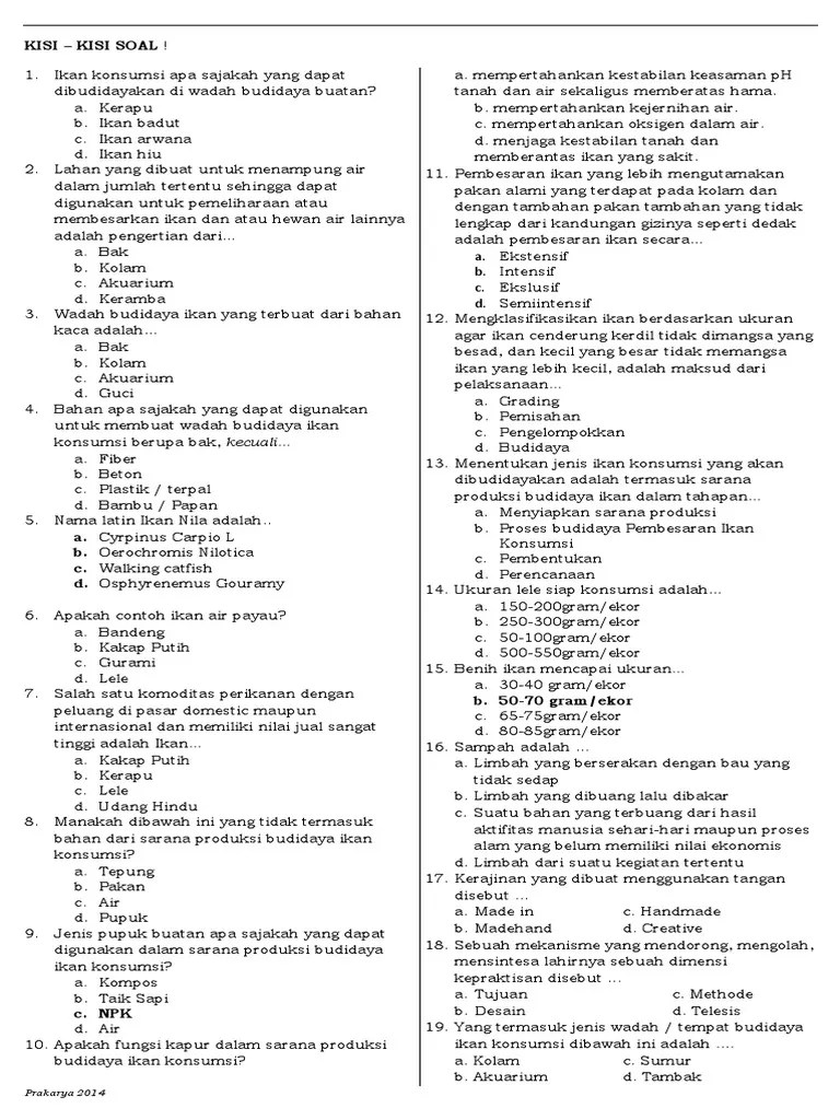 Soal pas ganjil prakarya kls 9 2018. Ruang lingkup mata pelajaran prakarya untuk smp kelas ix meliputi empat. Memahami konsep dn prodedur budidaya ikan konsumsi air tawar. Apakah arti pentingnya kualitas air dalam budi daya pembenihan ikan konsumsi? Kualitas air yang baik merupakan syarat mutlak keberhasilan usaha . Contoh soal pilihan ganda materi komoditas dan budi daya ikan konsumsi dalam pembelajaran prakarya kelas 9 semester 2 revisi terbaru. Media ajar digital informatika/prakarya smpn 4 kota bekasi. Pembuatan wadah budidaya ikan konsumsi. Searchpengertian.com | pada kesempatan kali ini admin akan membagikan contoh soal pilihan ganda prakarya kelas 9 semester 2 revisi terbaru. Budidaya ikan konsumsi ganda 13. Materi pintar soal ulangan uas/pas prakarya kelas 9 semester 1 dan kunci jawaban. Di bawah ini, soal pg prakarya kelas 9 semester ganjil jawablah dengan benar . 3.1 memahami komoditas ikan konsumsi yang dapat.